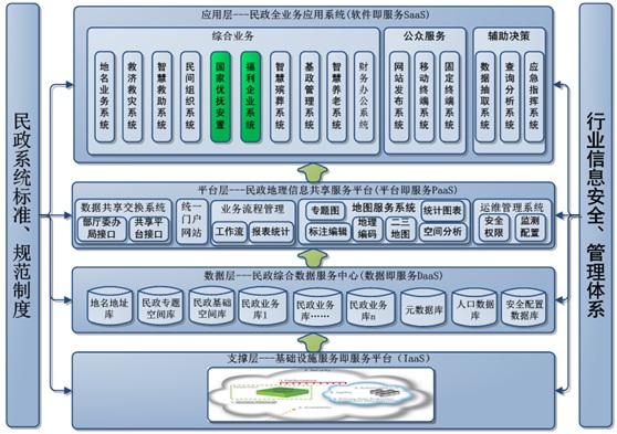 数字民政服务平台以各地市级民政专网、民政业务库、民政基础地理空间库为基础,利用地理信息,云计算,移动互联网、社交网络等新一代信息技术,实现各个分散的业务管理系统由数字民政服务平台统一管理;实现各分散业务系统之间数据的关联、共享、交互;实现在属性、二、三维空间上对民政工作的协同管理、监督与服务。